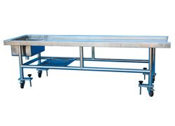 不锈钢板制作,明亮光洁,容易清洗,经久耐用。配备洗手池、不锈钢水龙头和喷淋冲水头。地脚有四个轮子,解剖床可随意移动,轮子有刹车装置,使用时可固定位置。
