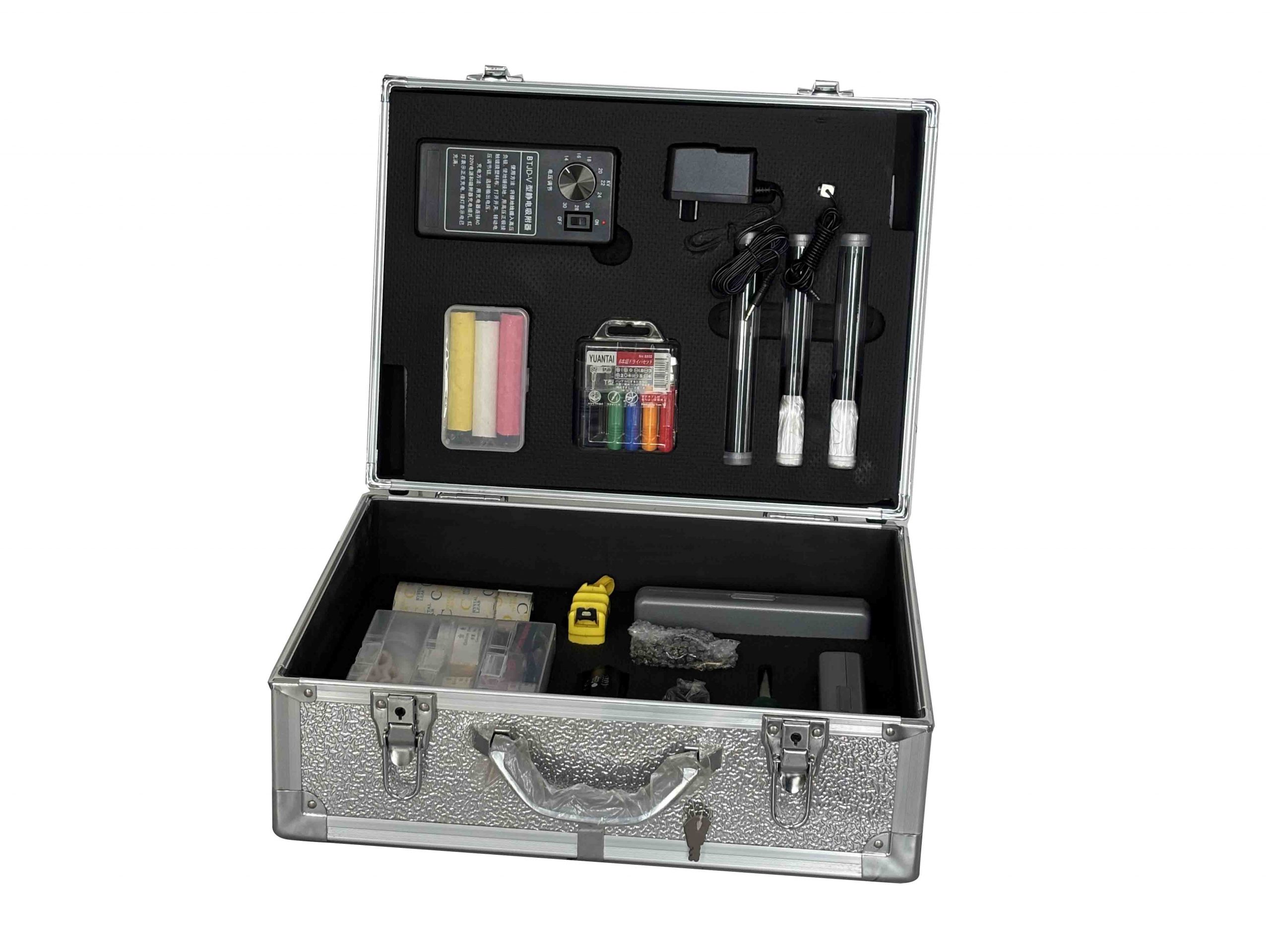 配置内容: 序号 产品名称 数量 1 Ⅴ型静电吸附器 1套 2 成趟足迹静电膜 8卷 3 单个足迹静电膜 10张 4 红黄白防水粉笔 3支 5 长条尼龙背包 1个 参数: 重量:2.7kg 尺寸:520x270x90mm 价格: