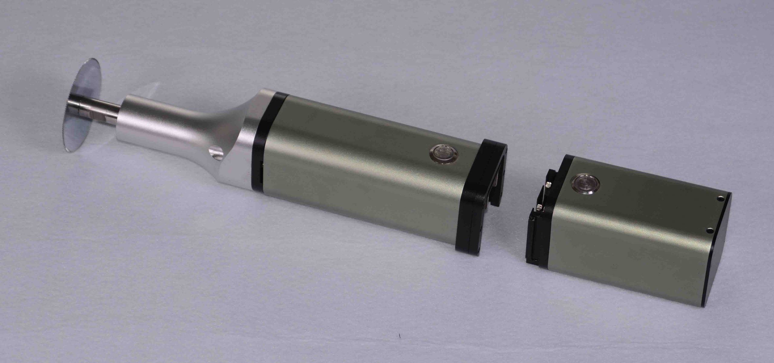 产品由主机、电池盒、锯片三部分组成。电池盒以卡槽方式连接主机,为主机供电,主机内部电机驱动传动轴高速摆动,传动轴带动前端锯片高速摆动。电池盒电量耗尽,滑动卡槽,卸下电池盒,可换装另一个电池盒。