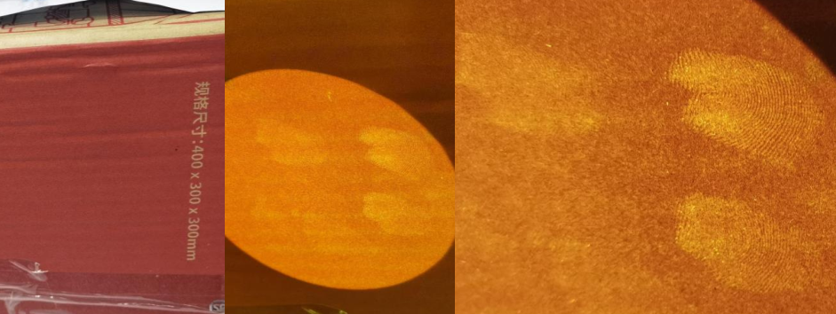 汗液、皮屑、脱落细胞、精斑、血迹、人体体液斑迹等都含有蛋白质和氨基酸。用超声波雾化器将物理吸附型生物物证激光靶向试剂雾化,让雾化的试剂飘落物体表面上,试剂会吸附在上述生物物证上。445nm激光照射,佩戴滤光眼镜观察,可以看到上述生物物证发出荧光。