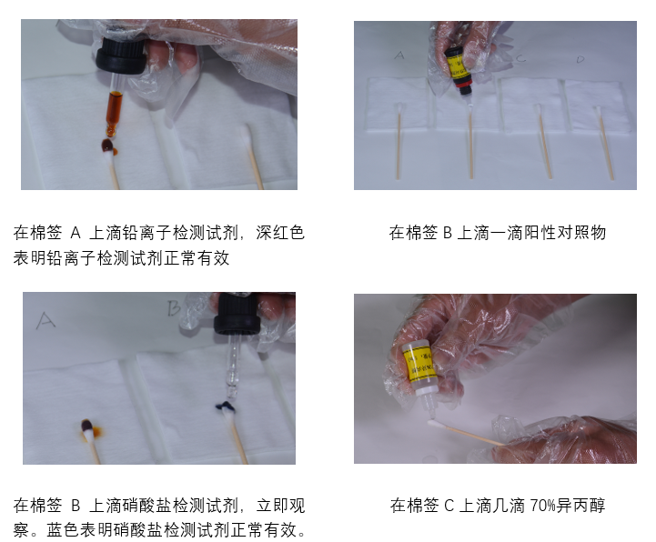 - 在棉签A上滴一滴阳性对照物,再滴一滴铅离子检测试剂,棉签变成深红色,表明铅离子检测试剂正常有效。